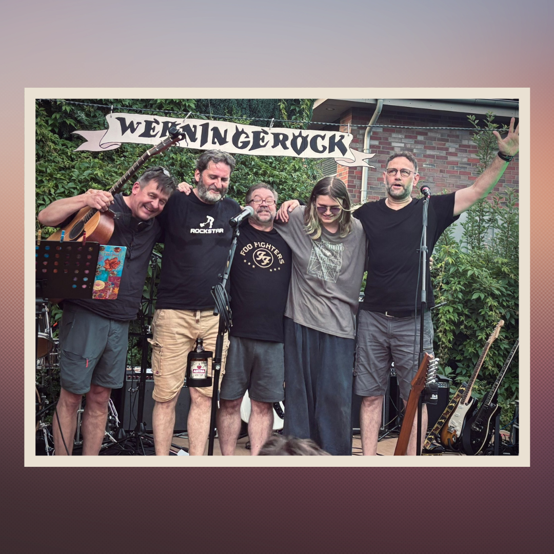 Mit 2 E-Gitarren, einer Akkustik-Gitarre, Bass, Schlagzeug und Mehrstimmigen Vocals sind wir angemessen ausgestattet für n ordentliches Brett Rockmusik.